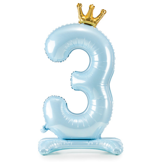 Balónek č. 3 – modrý, stojící, s korunkou (fóliový, 84 cm)