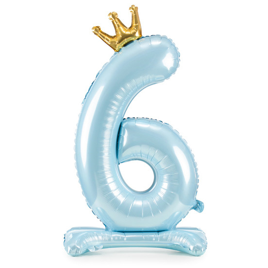Balónek č. 6 – modrý, stojící, s korunkou (fóliový, 84 cm)
