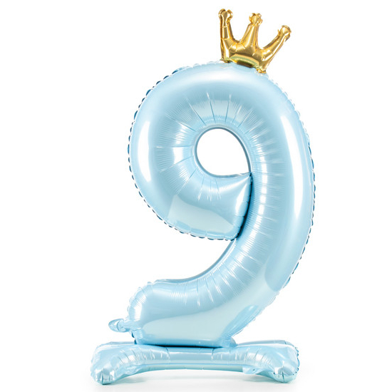 Balónek č. 9 – modrý, stojící, s korunkou (fóliový, 84 cm)