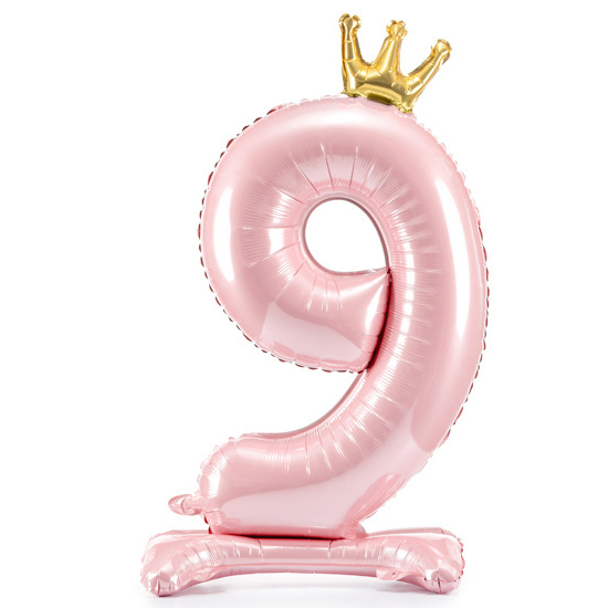 Balónek č. 9 – růžový, stojící, s korunkou (fóliový, 84 cm)