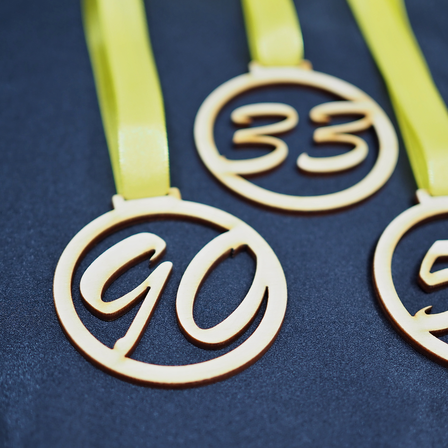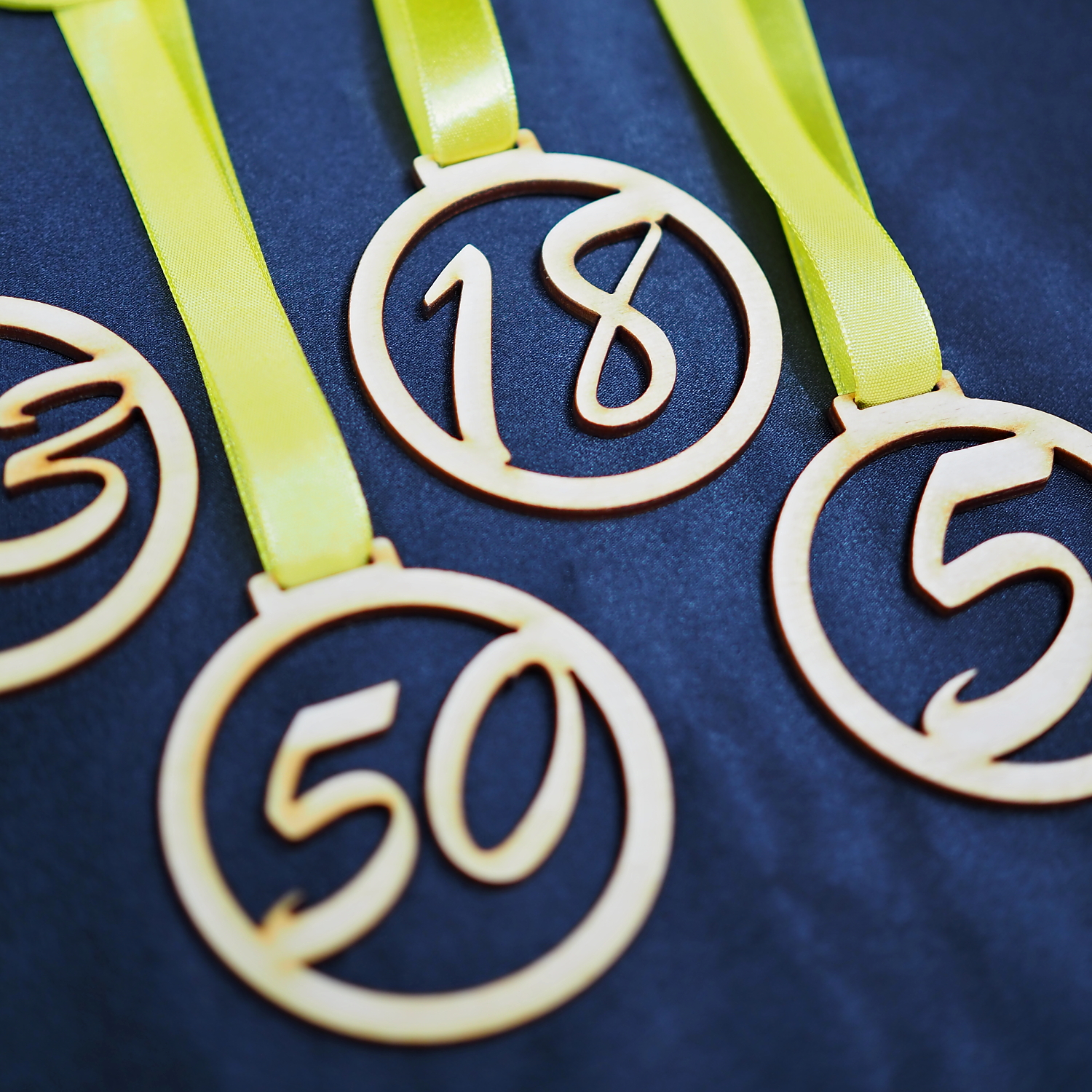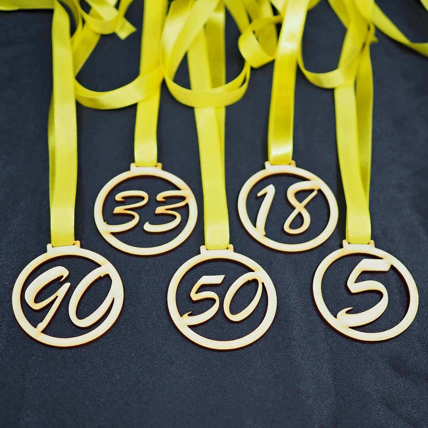 Malá dřevěná medaile s číslem jako doplněk k narozeninám, výročí a dalším událostem. Medaile je zhotovena z překližky o tloušťce 3 mm, má průměr 6 cm + 0,5 cm úchytka na stuhu, která je součástí balení. Zasíláme v plastovém sáčku.