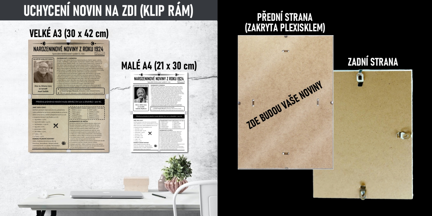 Noviny se zasílají buď e-mailem ve formátu .JPG ve velikosti A3 (můžete je pak tisknou A3 nebo A4, a to v béžové nebo černobílé verzi na běžný kancelářský papír) anebo se zasílají vytištěné fyzicky (Balíkovna, Zásilkovna, Balíkovna na adresu, Express Balíkovna na adresu, případně osobní výdej v Pelhřimově). Zasíláme buď v tubusu (s potiskem či bez) nebo zalaminované v matné nelesknoucí se folii anebo v klip rámu na zeď, který je bezrámečkový s pevnou zadní stranou a plexisklem zepředu. (Pokud máte 2 strany novin a chcete je do klip rámu, je potřeba objednat rámy dva). Přední strana novin může obsahovat jen 1 foto a tubus s potiskem také, zadní strana novin až 7 fotografií.