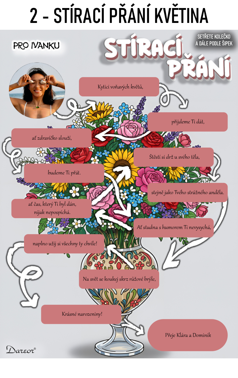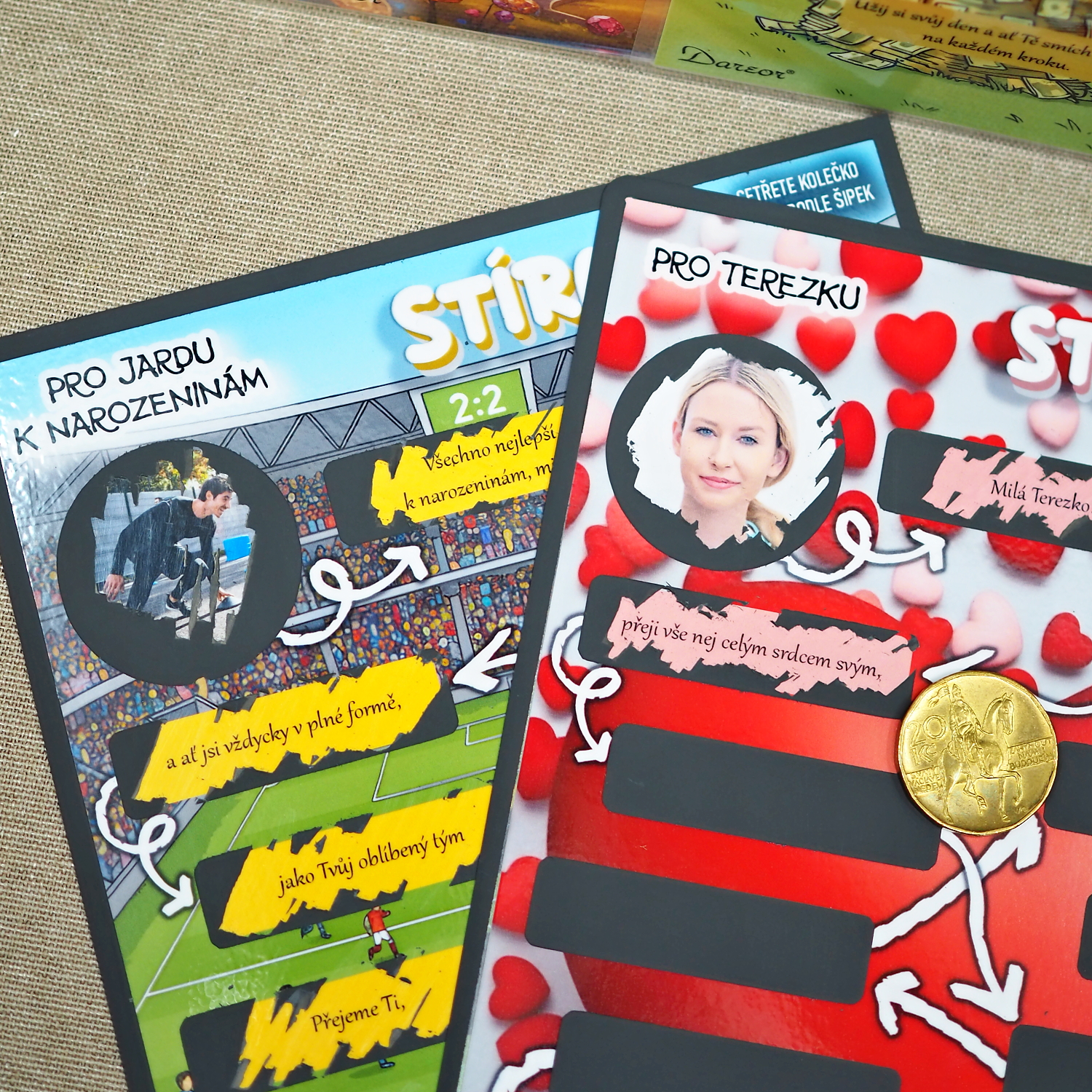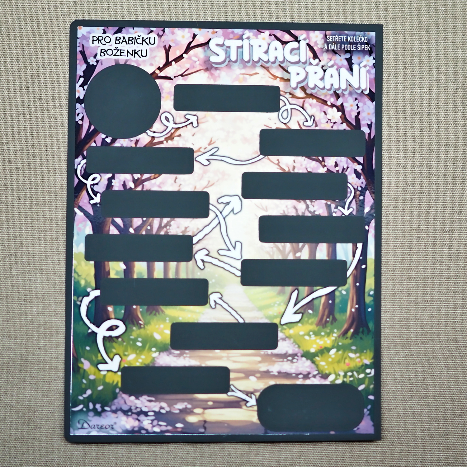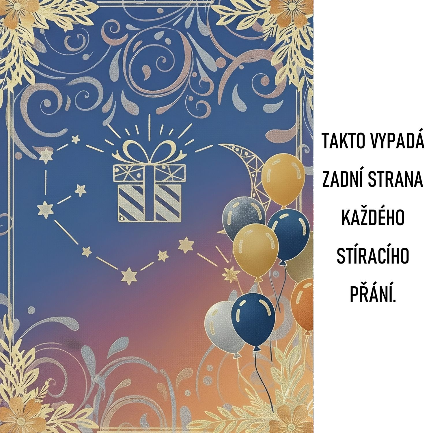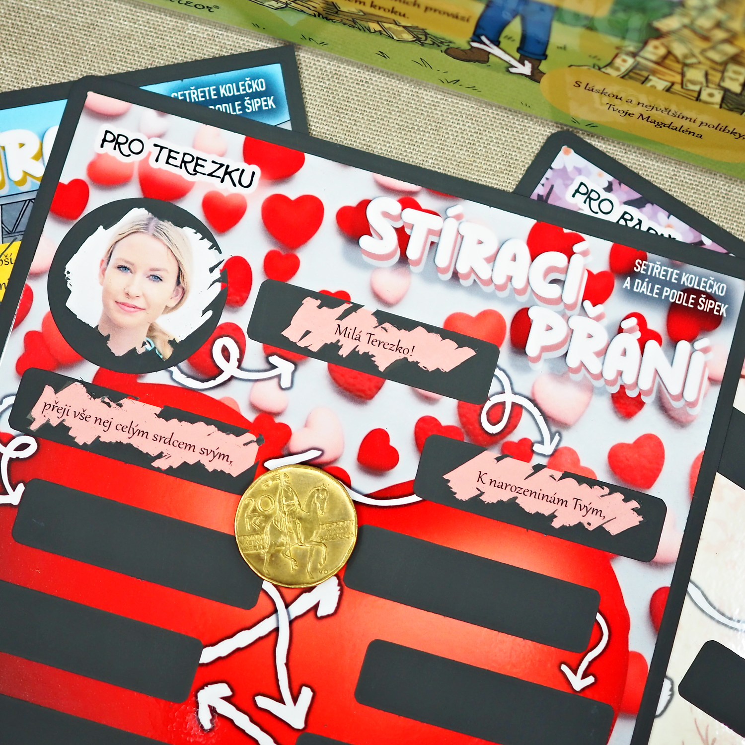 Stírací přáníčko k narozeninám, svátku, MDŽ, Valentýnu, Velikonocům nebo jiným příležitostem nabízí originální a vtipný způsob, jak popřát svým blízkým nebo jak předat libovolný text. Aby si obdarovaný přání přečetl, bude muset postupně kovovou mincí stírat všechny nezobrazené plochy. Pro ještě více zábavy to ale není jen tak. Je totiž potřeba začít stírat od kolečka vlevo nahoře a následně pokračovat přesně podle šipek. Jen tak bude textové přáníčko dávat smysl, protože věty jsou seřazeny za sebou v pořadí právě podle šipek.