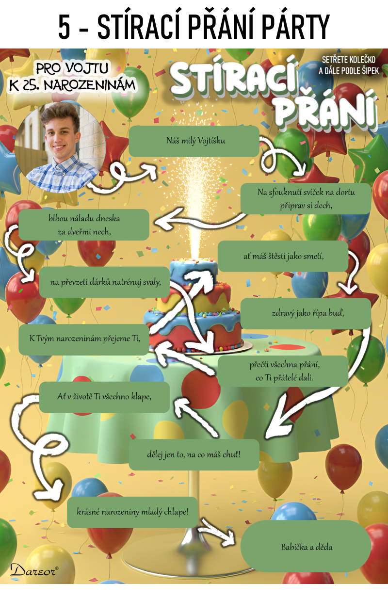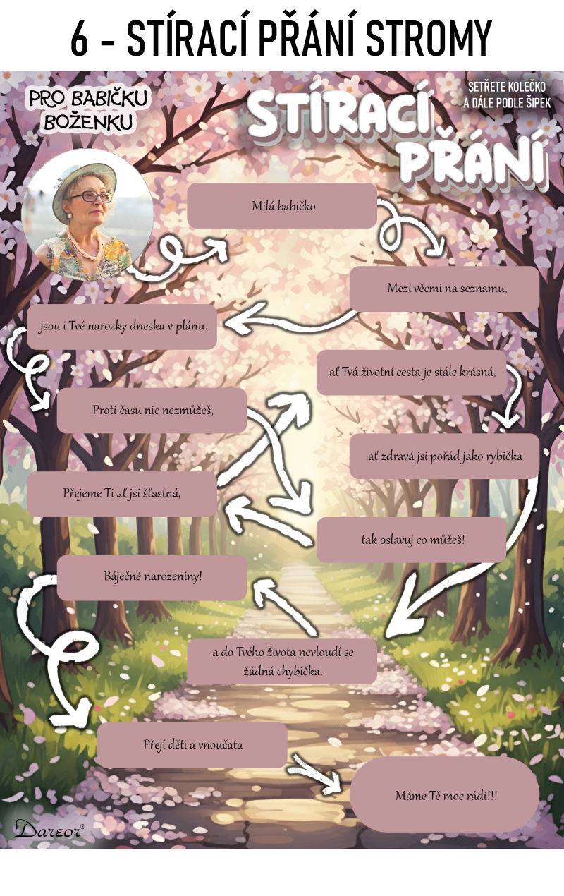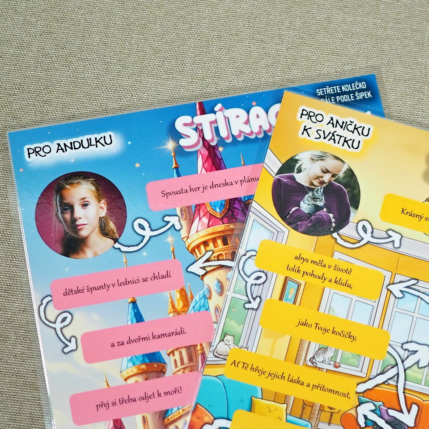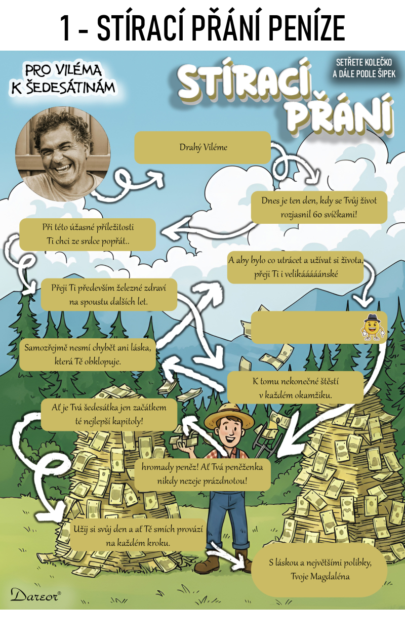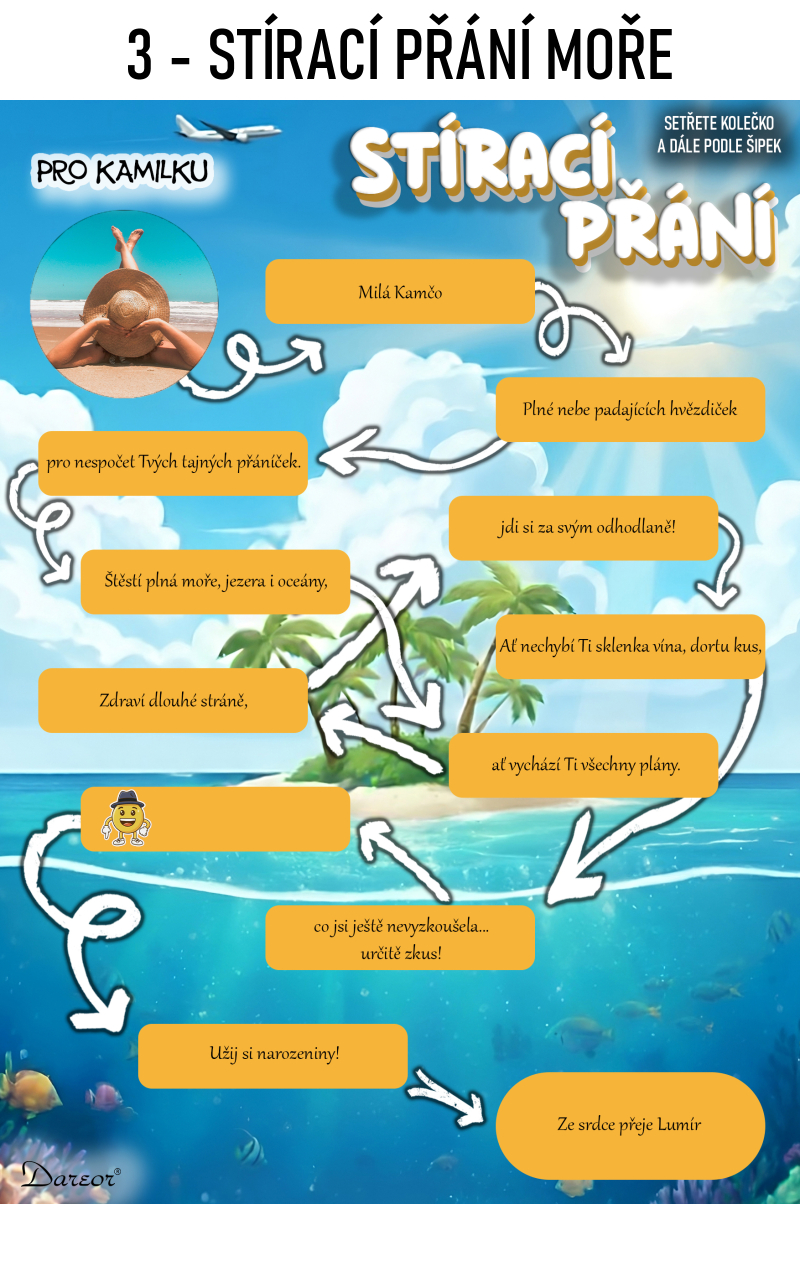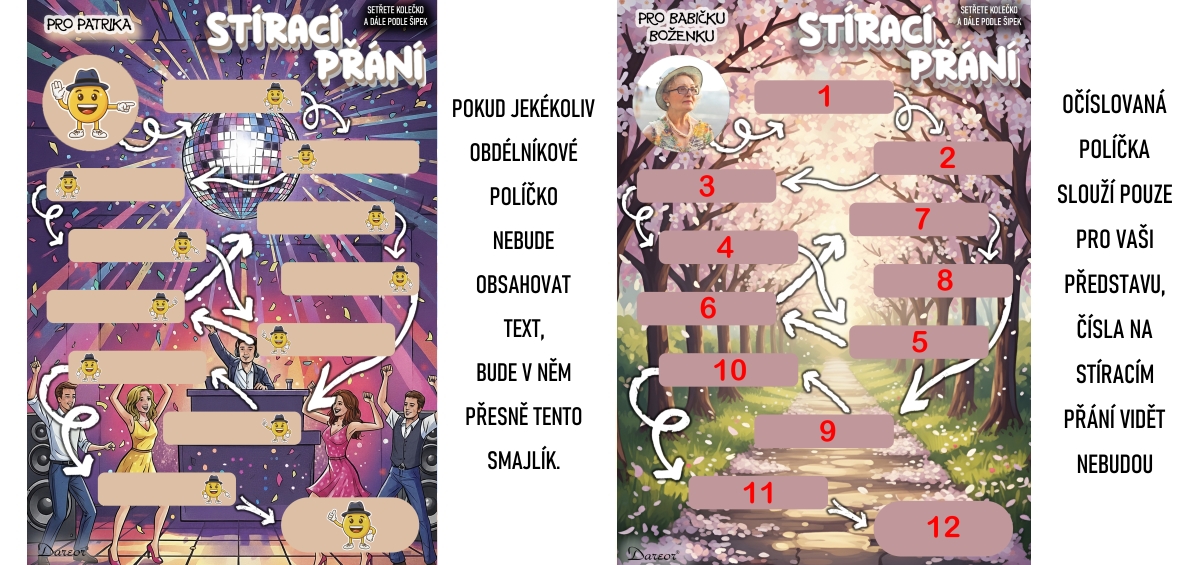 Stírací přáníčko k narozeninám, svátku, MDŽ, Valentýnu, Velikonocům nebo jiným příležitostem nabízí originální a vtipný způsob, jak popřát svým blízkým nebo jak předat libovolný text. Aby si obdarovaný přání přečetl, bude muset postupně kovovou mincí stírat všechny nezobrazené plochy. Pro ještě více zábavy to ale není jen tak. Je totiž potřeba začít stírat od kolečka vlevo nahoře a následně pokračovat přesně podle šipek. Jen tak bude textové přáníčko dávat smysl, protože věty jsou seřazeny za sebou v pořadí právě podle šipek.