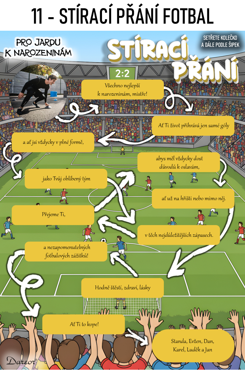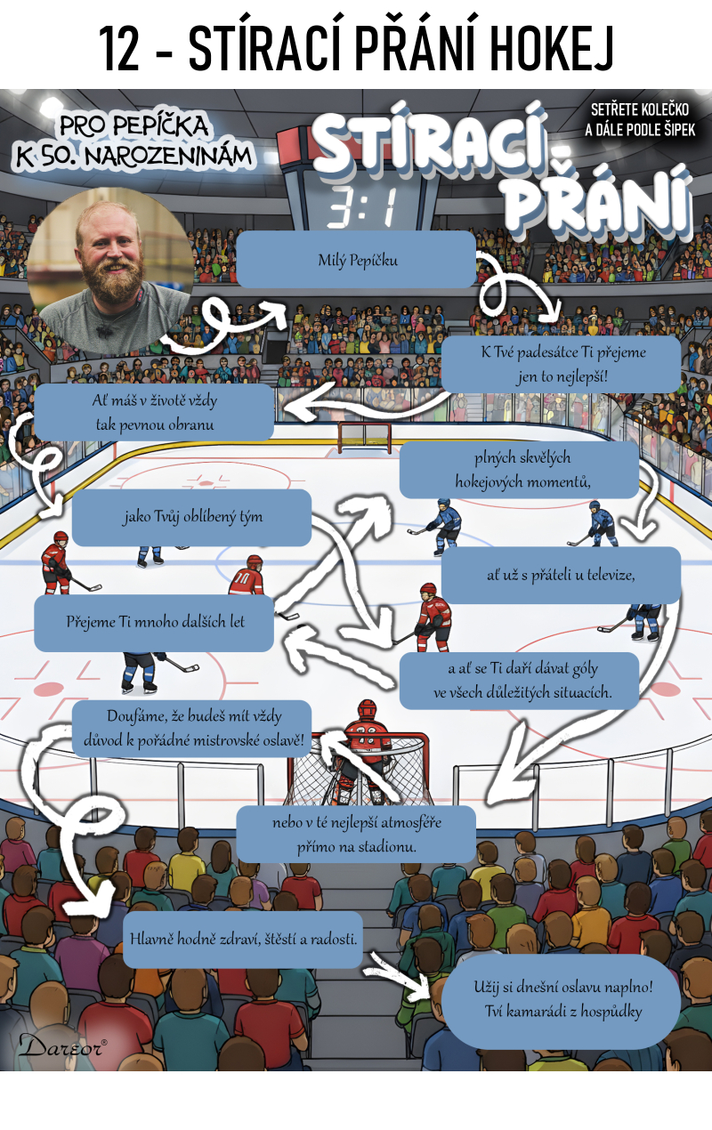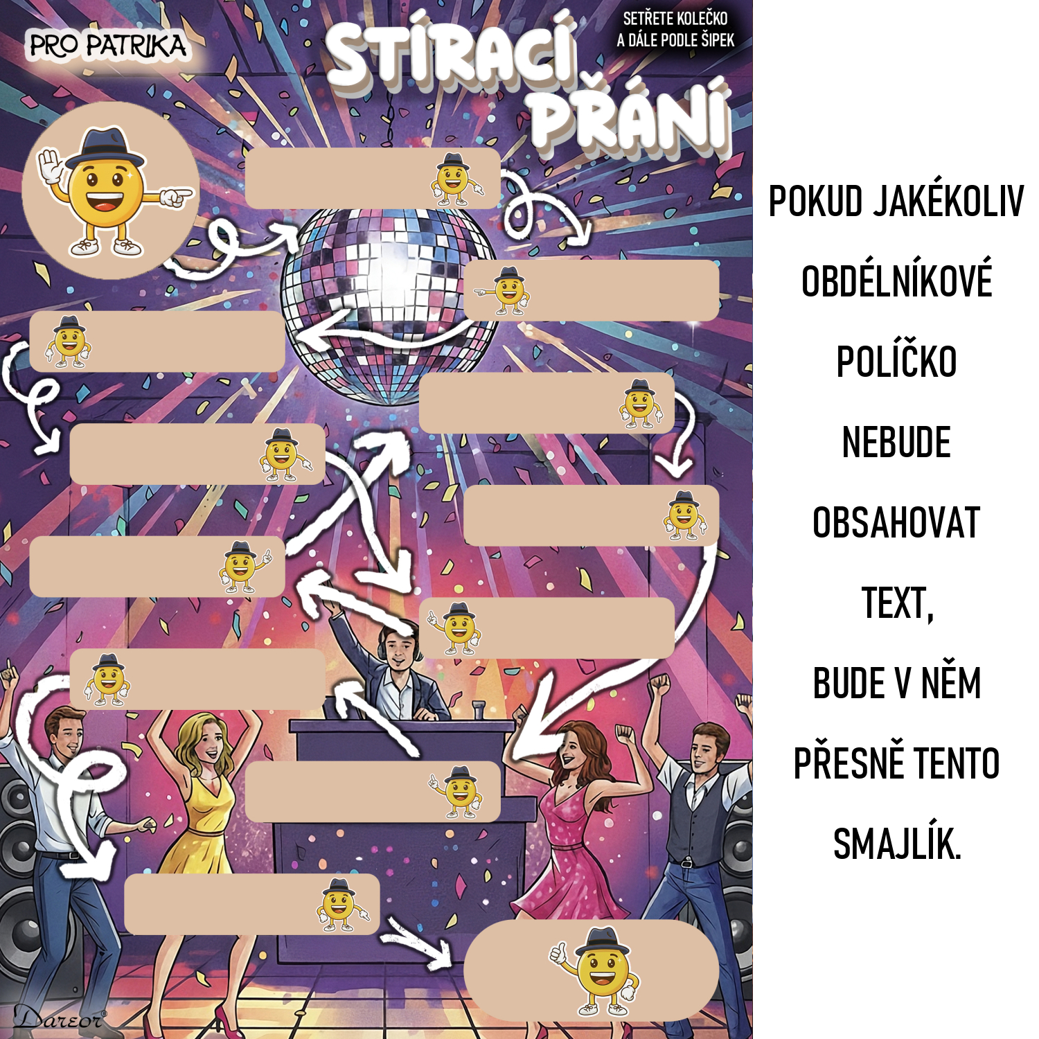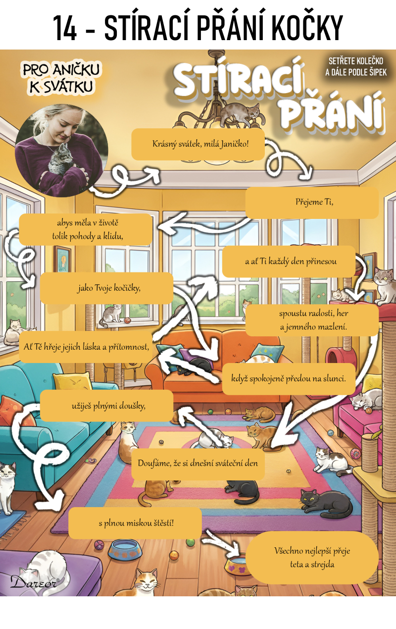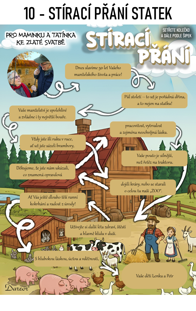 Stírací přáníčko k narozeninám, svátku, MDŽ, Valentýnu, Velikonocům nebo jiným příležitostem nabízí originální a vtipný způsob, jak popřát svým blízkým nebo jak předat libovolný text. Aby si obdarovaný přání přečetl, bude muset postupně kovovou mincí stírat všechny nezobrazené plochy. Pro ještě více zábavy to ale není jen tak. Je totiž potřeba začít stírat od kolečka vlevo nahoře a následně pokračovat přesně podle šipek. Jen tak bude textové přáníčko dávat smysl, protože věty jsou seřazeny za sebou v pořadí právě podle šipek.
