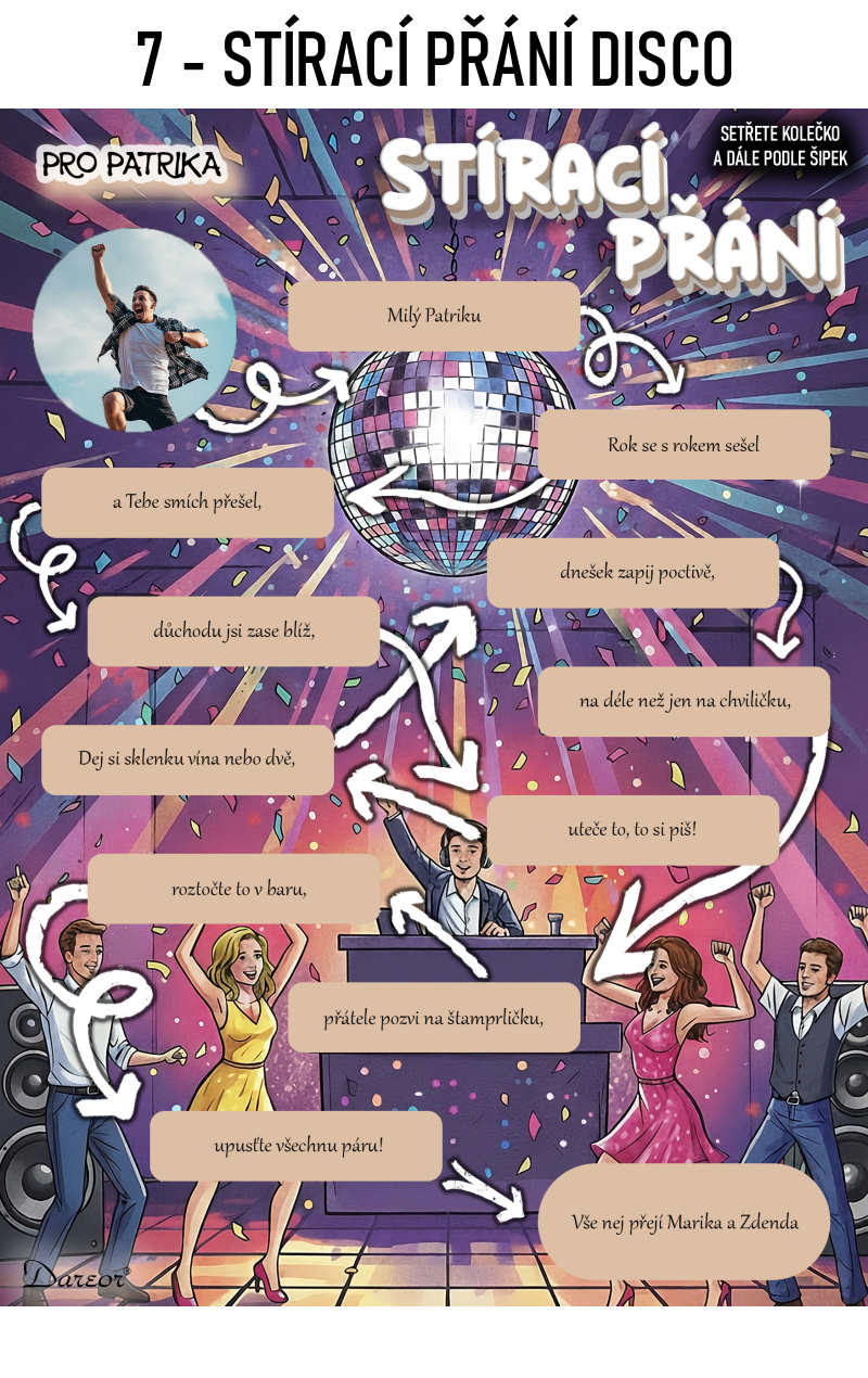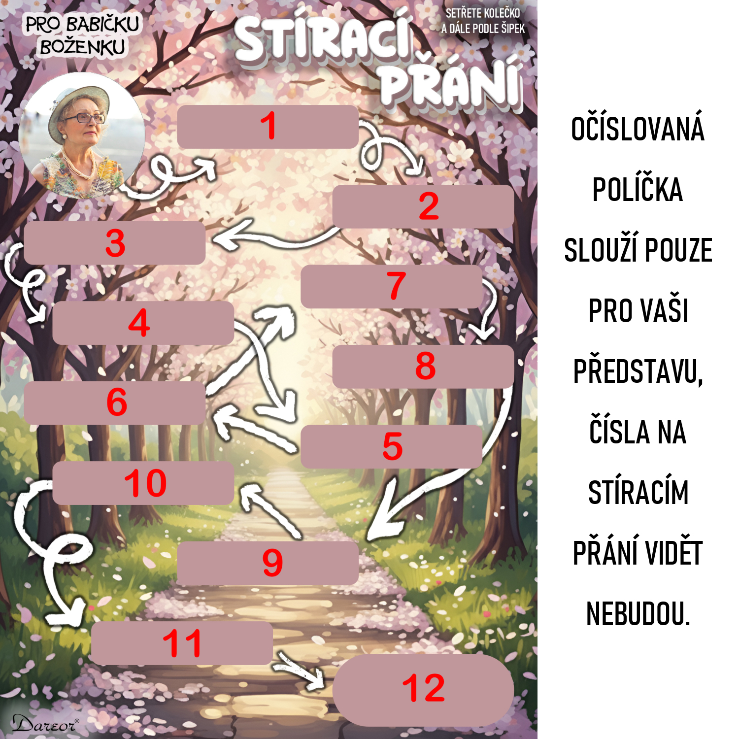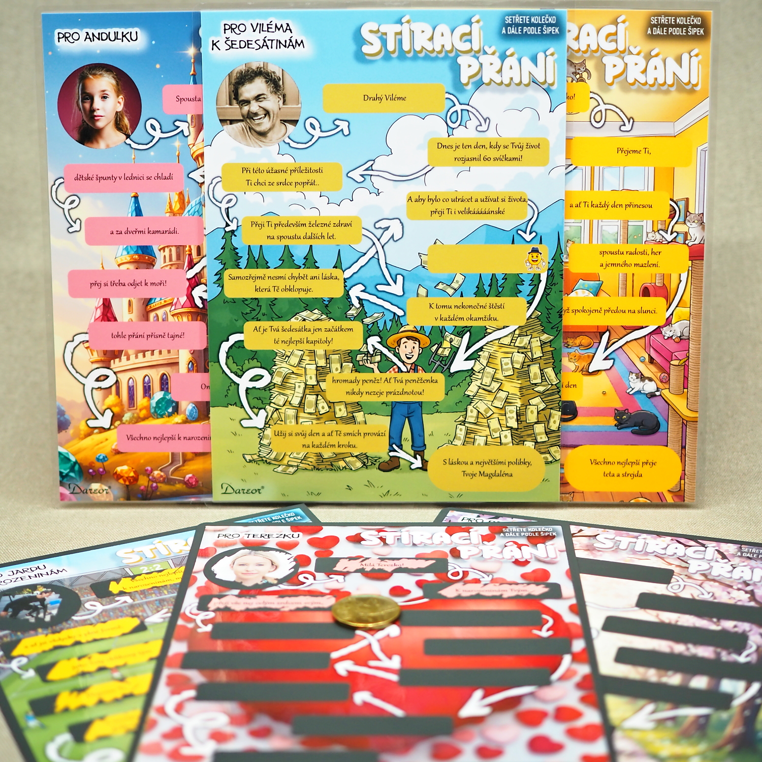 Pod startovním kolečkem se může ukrývat příplatková fotografie, ideálně obdarovaného, případně lze ponechat smajlíka tak, jak je vidět ve fotogalerii. Následuje 12 stíracích ploch, kdy do každé plochy se vejdou až 2 krátké řádky textu. Je na vás, zda si přesně zvolíte, jaký text do jednotlivých políček chcete nebo zda nám pošlete celé přání a jeho rozdělení na 12 částí necháte na nás. Pro případ, že vaše přání bude kratší bez možnosti rozdělení na 12 částí, bude v každém volném políčku zobrazen smajlík.