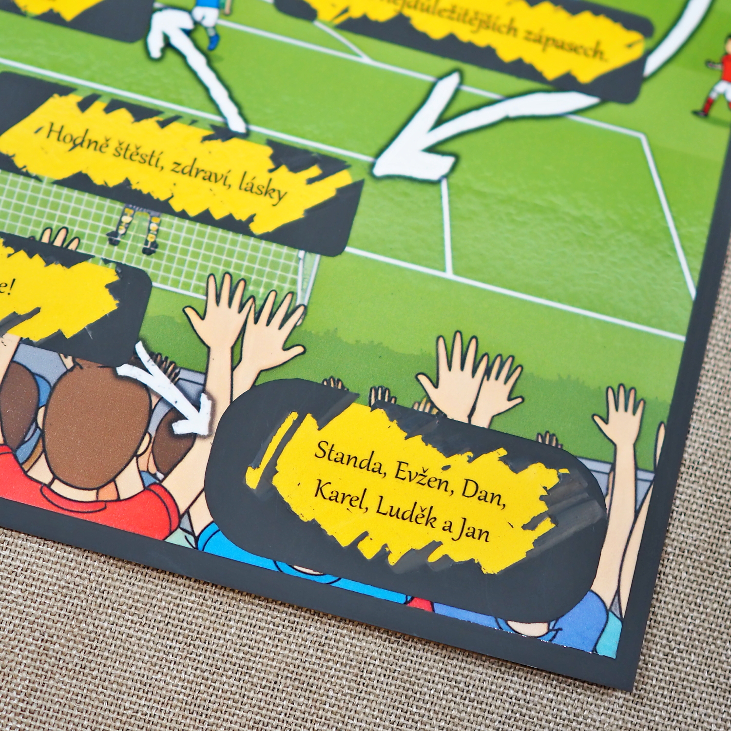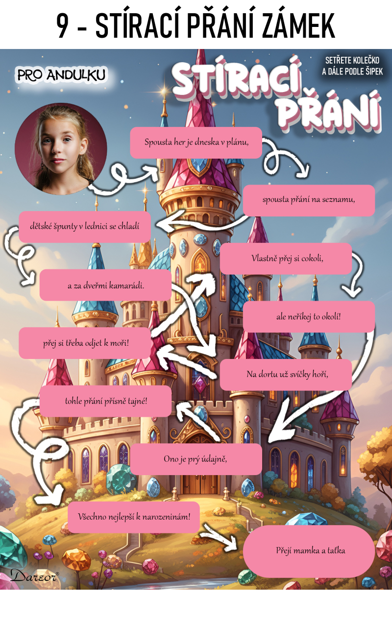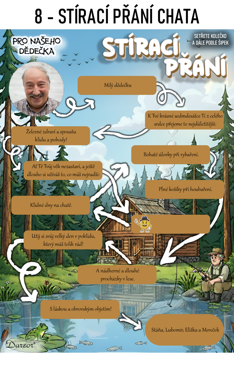 Pod startovním kolečkem se může ukrývat příplatková fotografie, ideálně obdarovaného, případně lze ponechat smajlíka tak, jak je vidět ve fotogalerii. Následuje 12 stíracích ploch, kdy do každé plochy se vejdou až 2 krátké řádky textu. Je na vás, zda si přesně zvolíte, jaký text do jednotlivých políček chcete nebo zda nám pošlete celé přání a jeho rozdělení na 12 částí necháte na nás. Pro případ, že vaše přání bude kratší bez možnosti rozdělení na 12 částí, bude v každém volném políčku zobrazen smajlík.