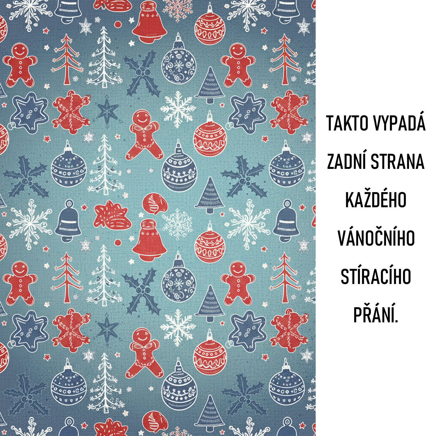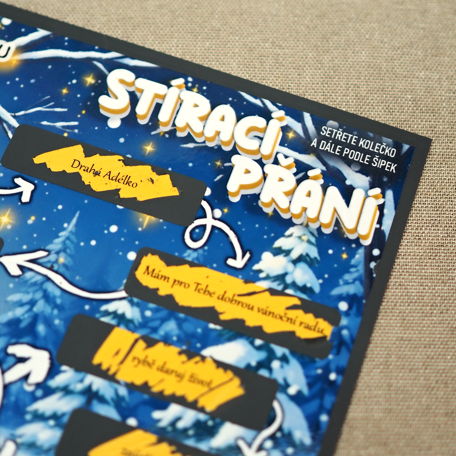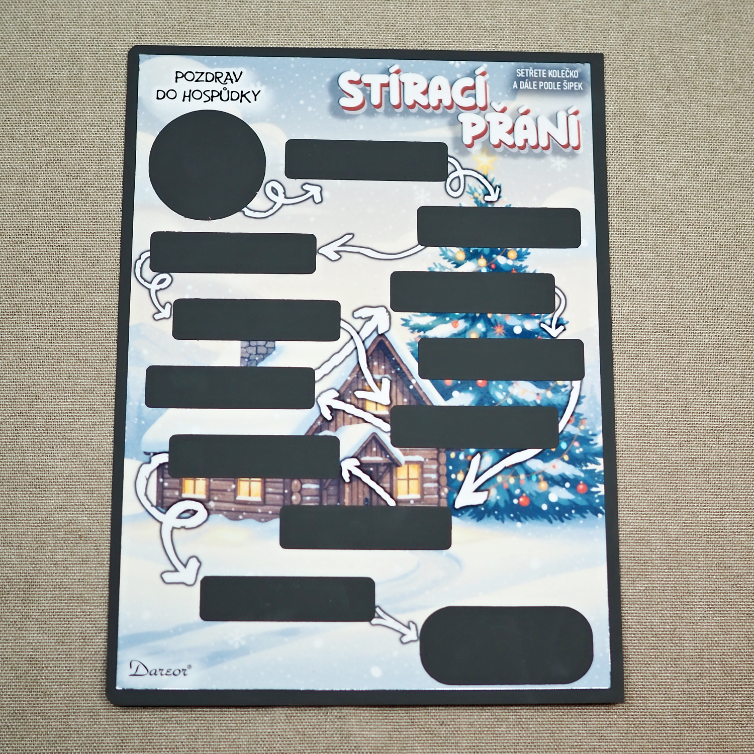 Vánoční stírací přáníčko nabízí originální a vtipný způsob, jak popřát svým blízkým krásné svátky nebo jak předat libovolný text. Aby si obdarovaný přání přečetl, bude muset postupně kovovou mincí stírat všechny nezobrazené plochy. Pro ještě více zábavy to ale není jen tak. Je totiž potřeba začít stírat od kolečka vlevo nahoře a následně pokračovat přesně podle šipek. Jen tak bude textové přáníčko dávat smysl, protože věty jsou seřazeny za sebou v pořadí právě podle šipek.