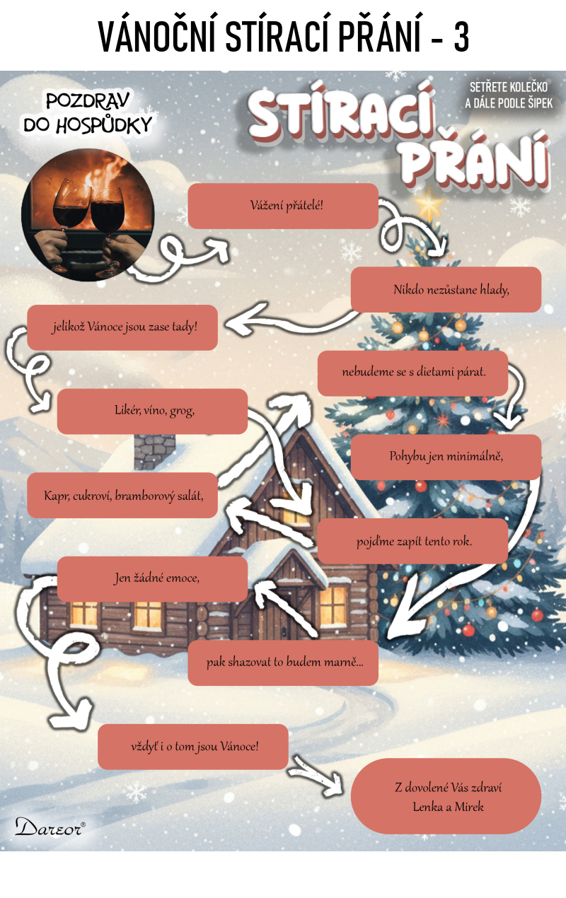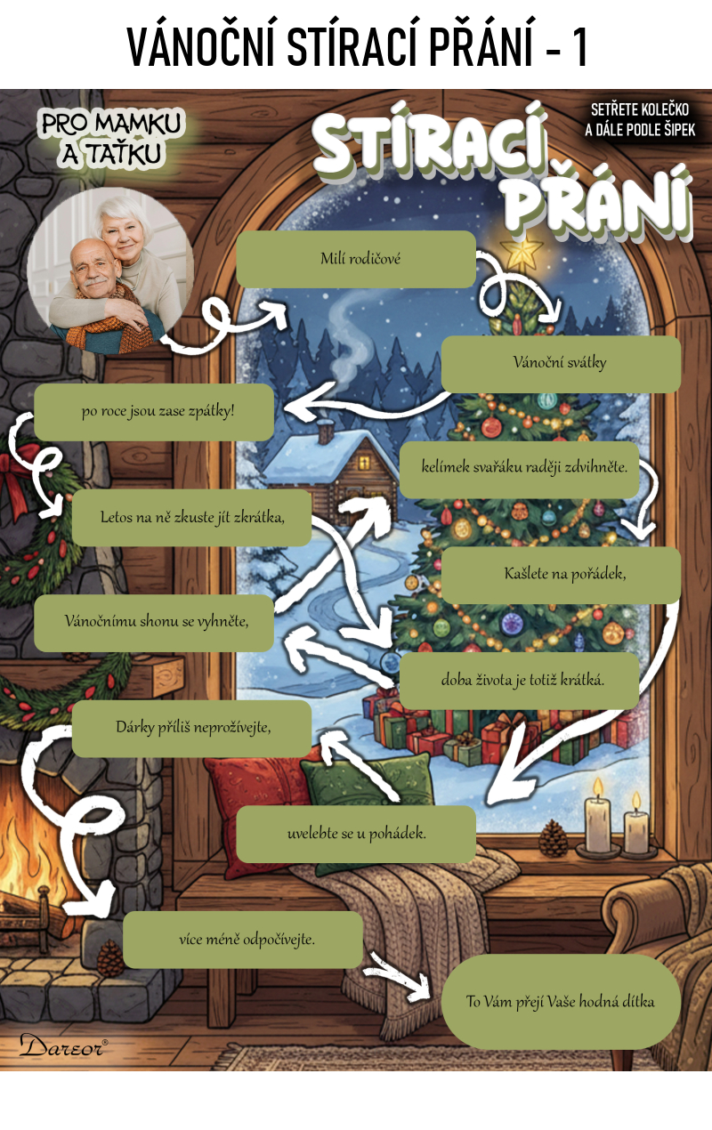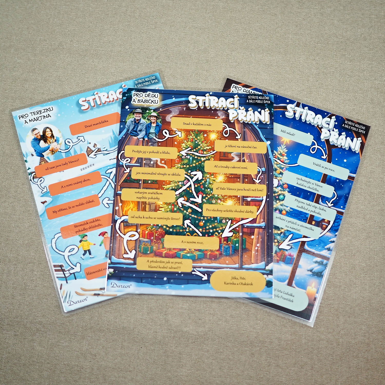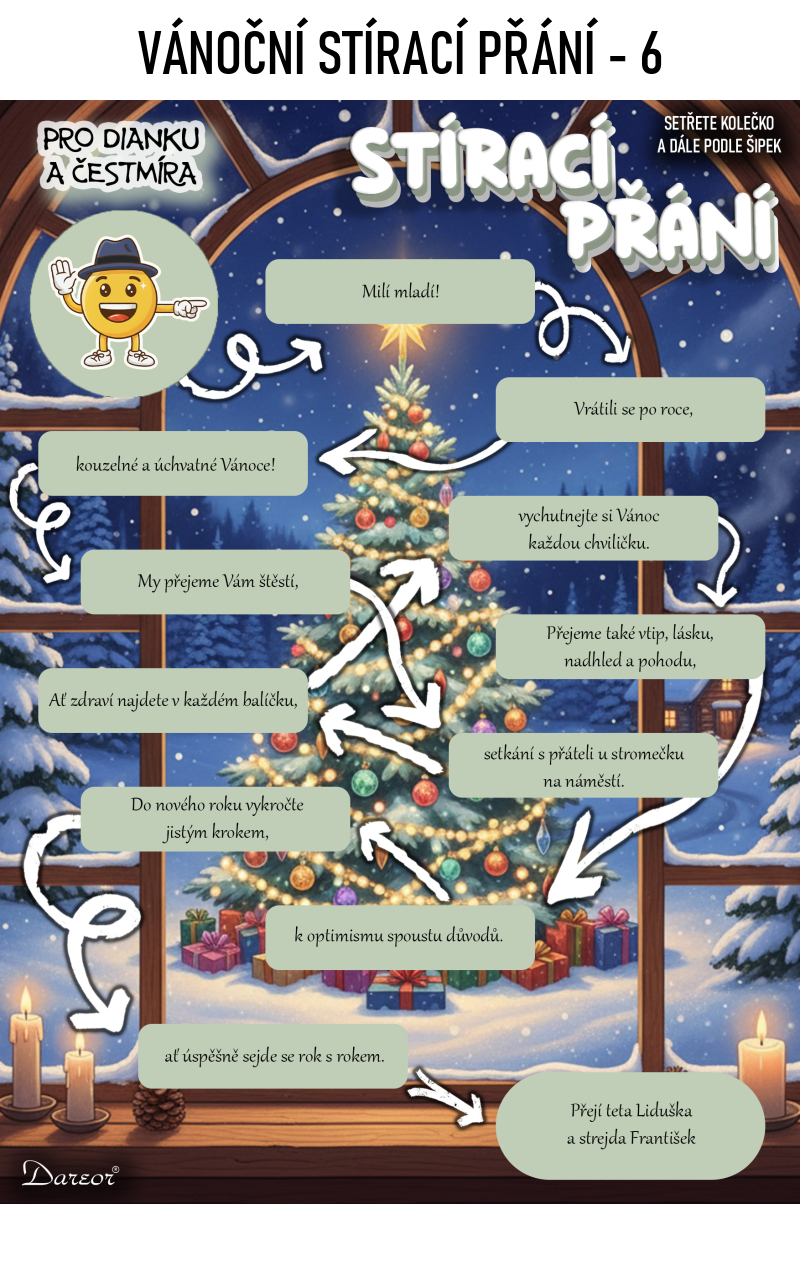 Vánoční stírací přáníčko nabízí originální a vtipný způsob, jak popřát svým blízkým krásné svátky nebo jak předat libovolný text. Aby si obdarovaný přání přečetl, bude muset postupně kovovou mincí stírat všechny nezobrazené plochy. Pro ještě více zábavy to ale není jen tak. Je totiž potřeba začít stírat od kolečka vlevo nahoře a následně pokračovat přesně podle šipek. Jen tak bude textové přáníčko dávat smysl, protože věty jsou seřazeny za sebou v pořadí právě podle šipek.