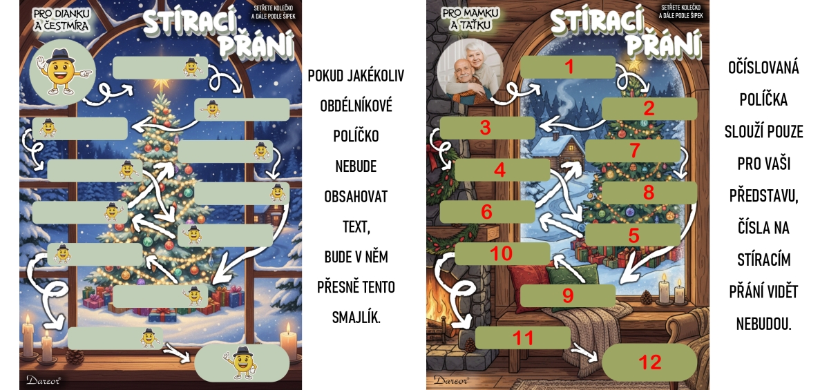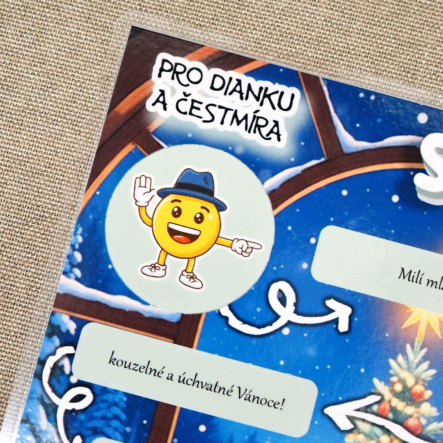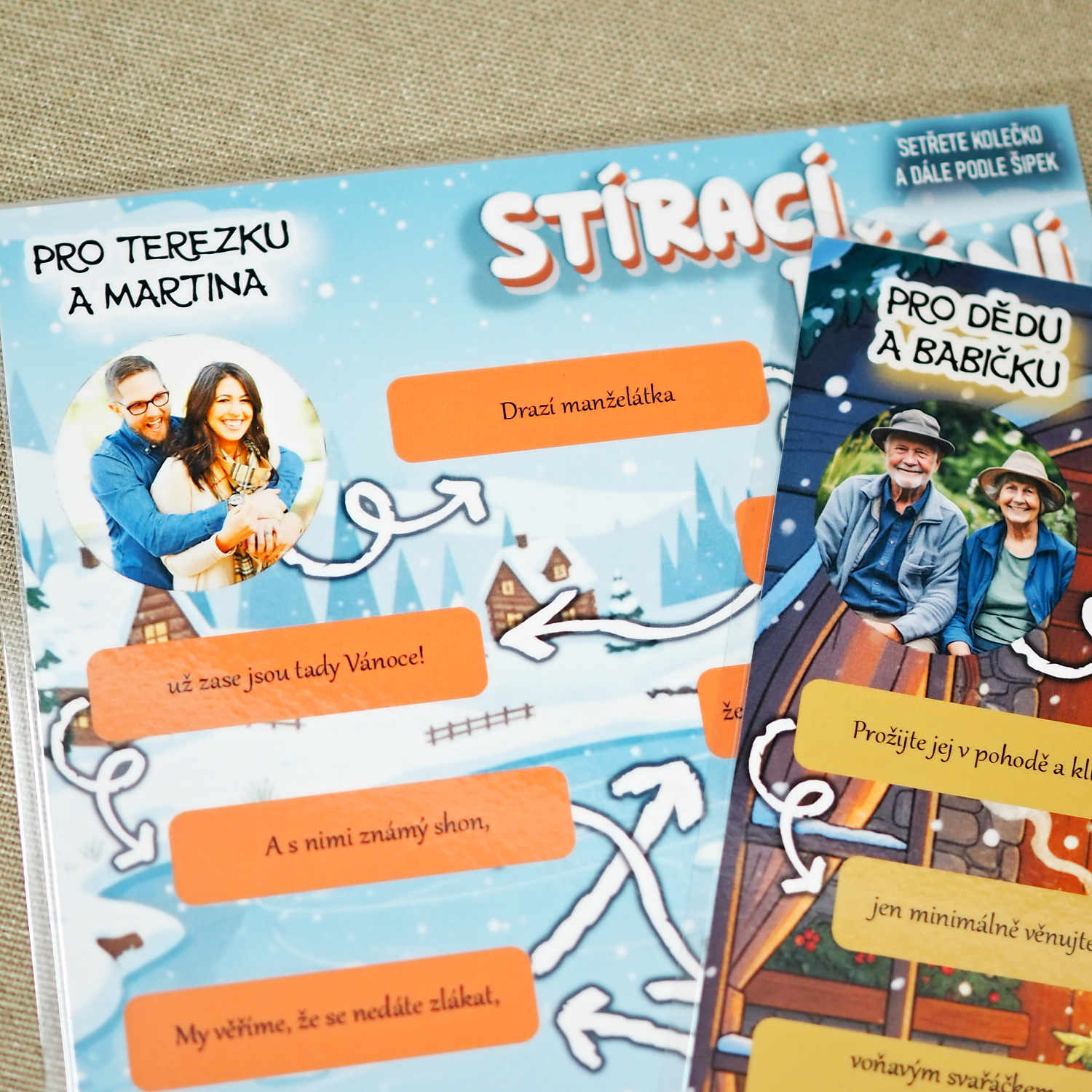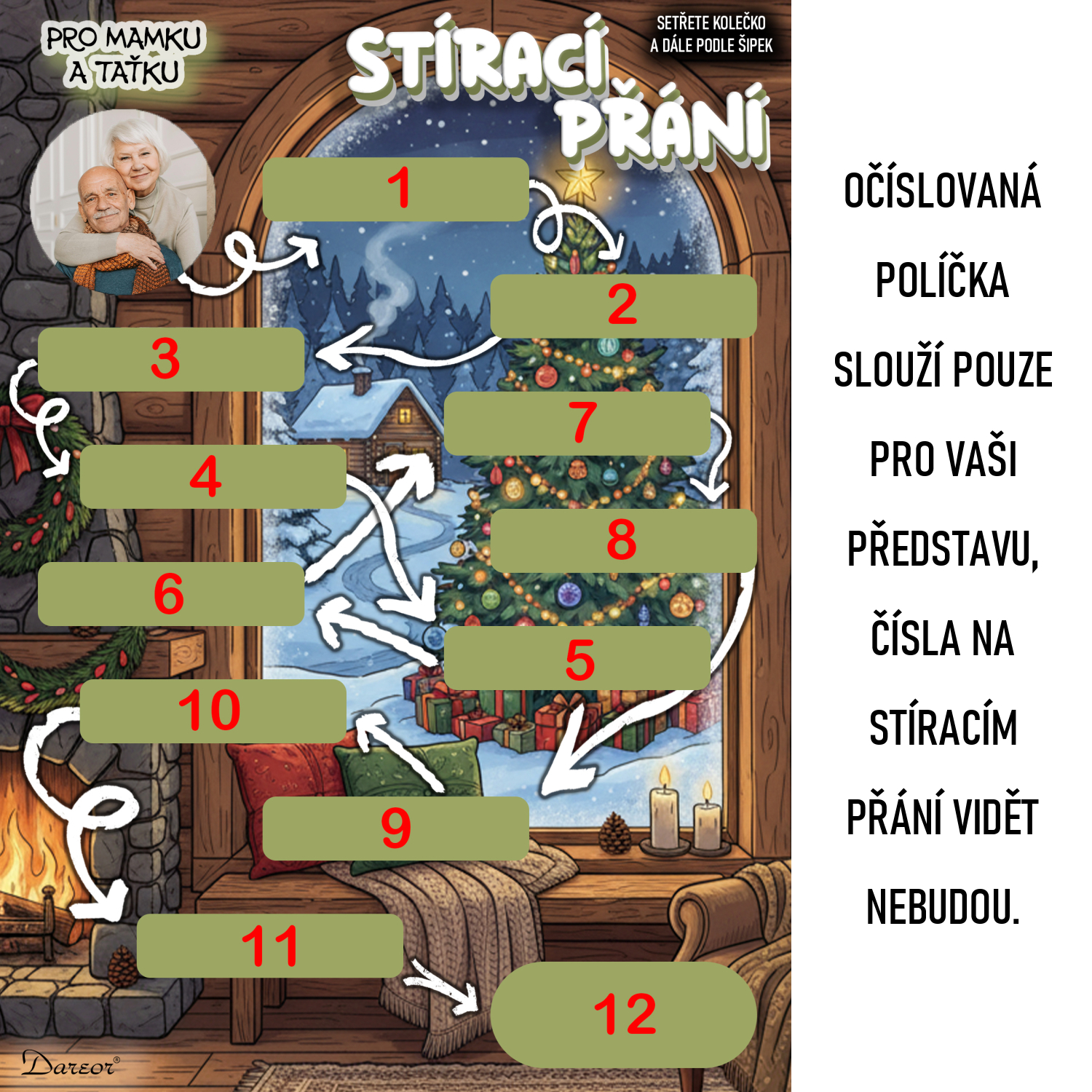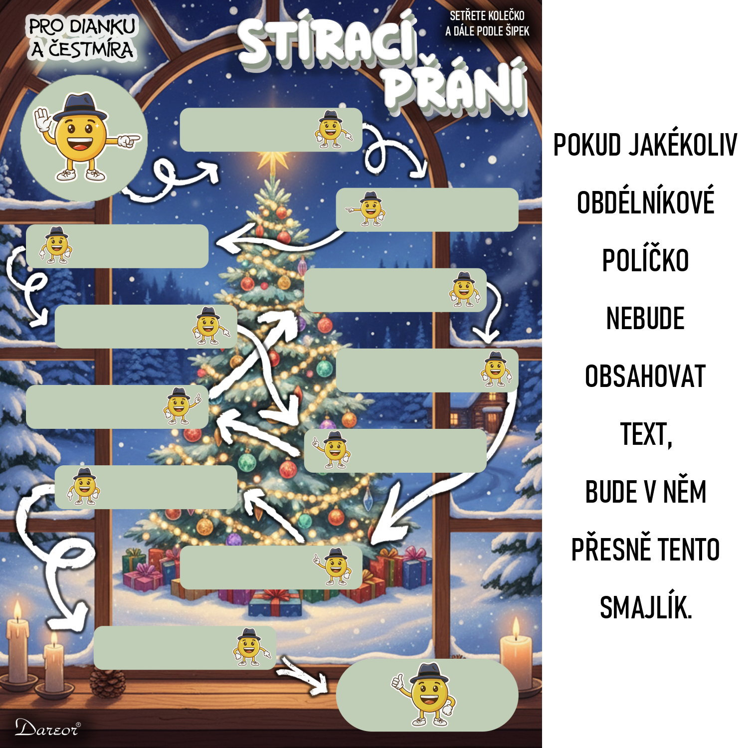 Pod startovním kolečkem se může ukrývat příplatková fotografie, ideálně obdarovaného, případně lze ponechat smajlíka tak, jak je vidět ve fotogalerii. Následuje 12 stíracích ploch, kdy do každé plochy se vejdou až 2 krátké řádky textu. Je na vás, zda si přesně zvolíte, jaký text do jednotlivých políček chcete nebo zda nám pošlete celé vánoční přání a jeho rozdělení na 12 částí necháte na nás. Pro případ, že vaše vánoční přání bude kratší bez možnosti rozdělení na 12 částí, bude v každém volném políčku zobrazen smajlík.