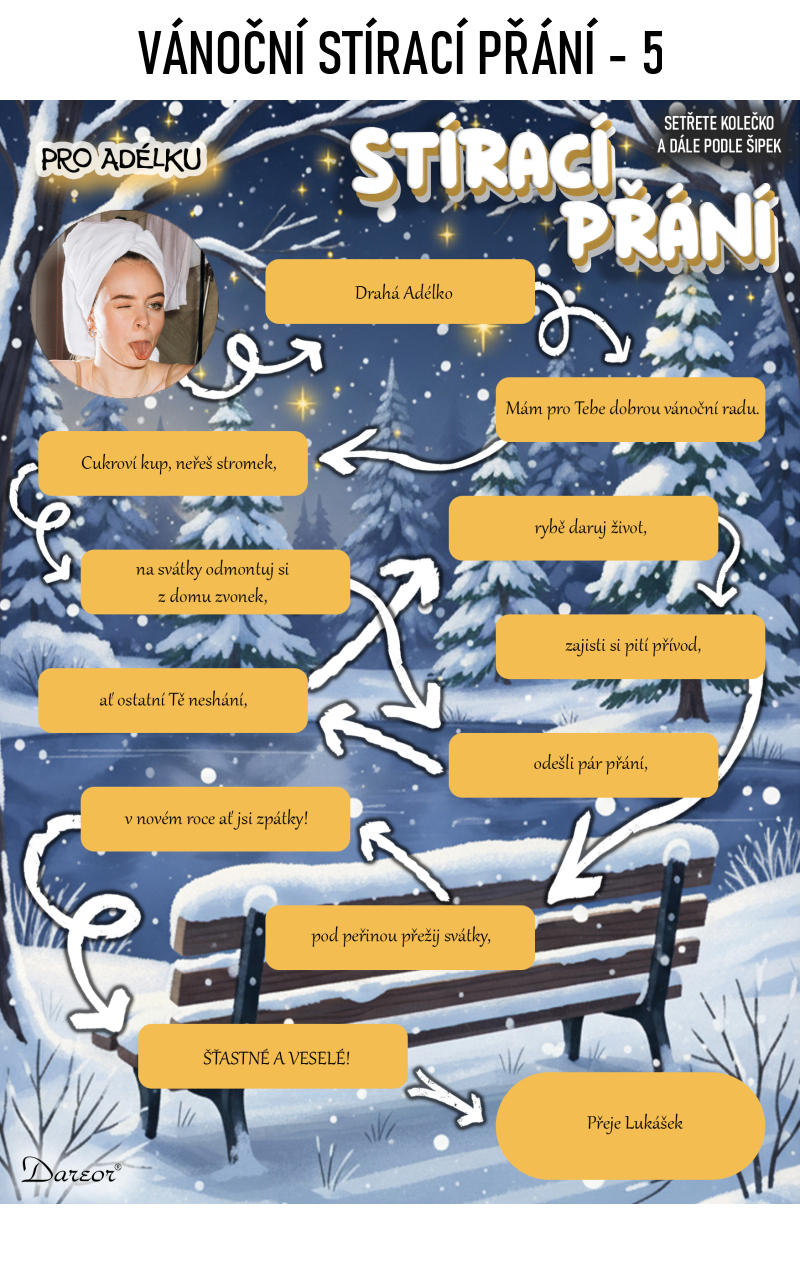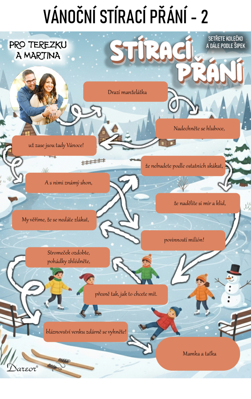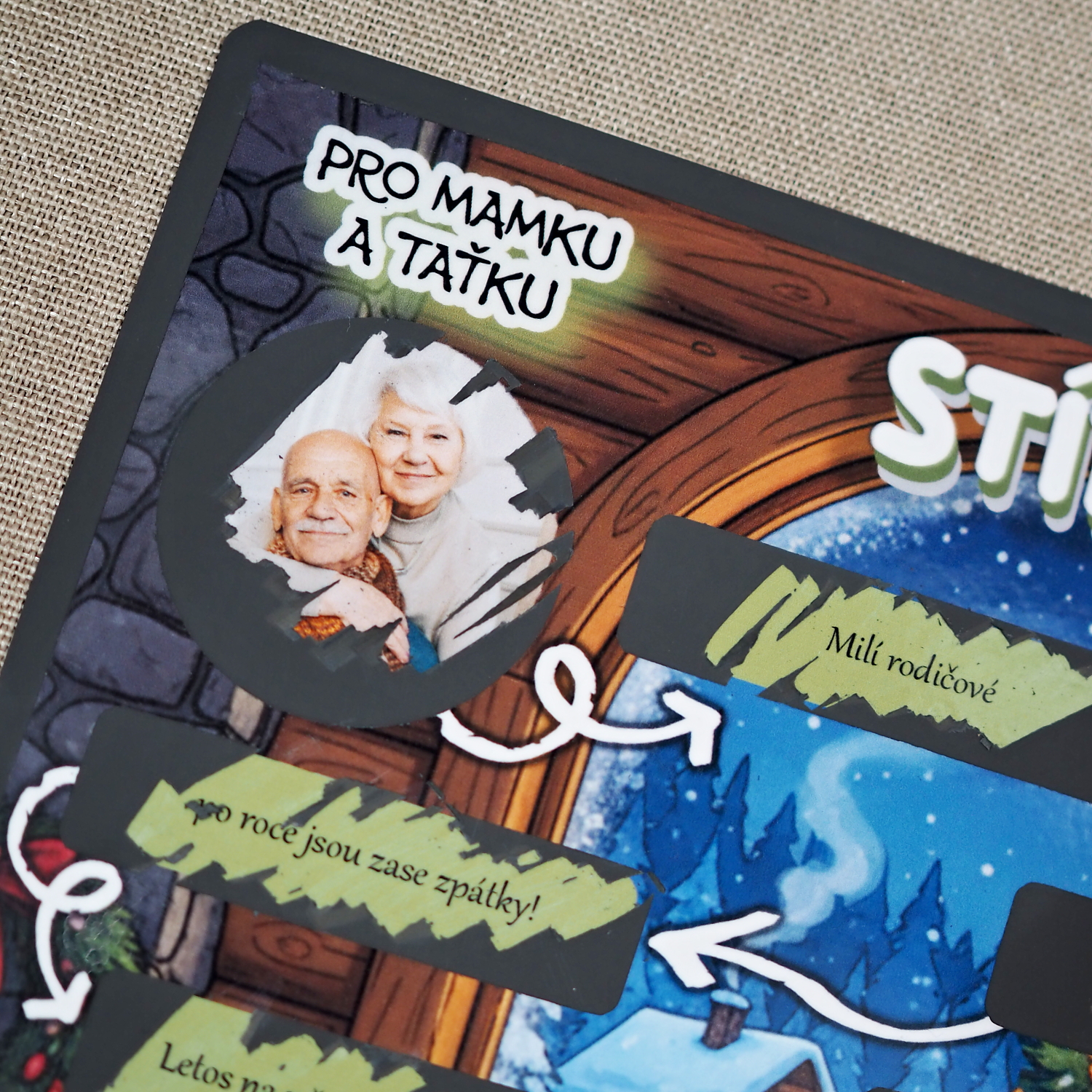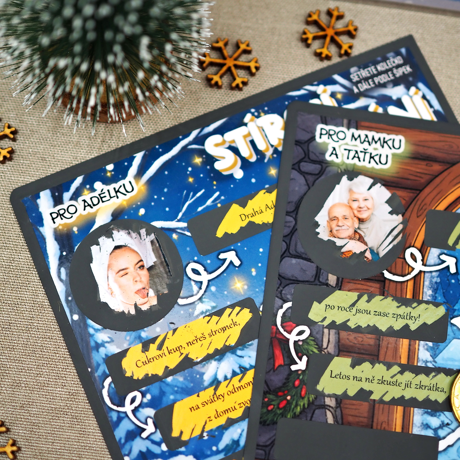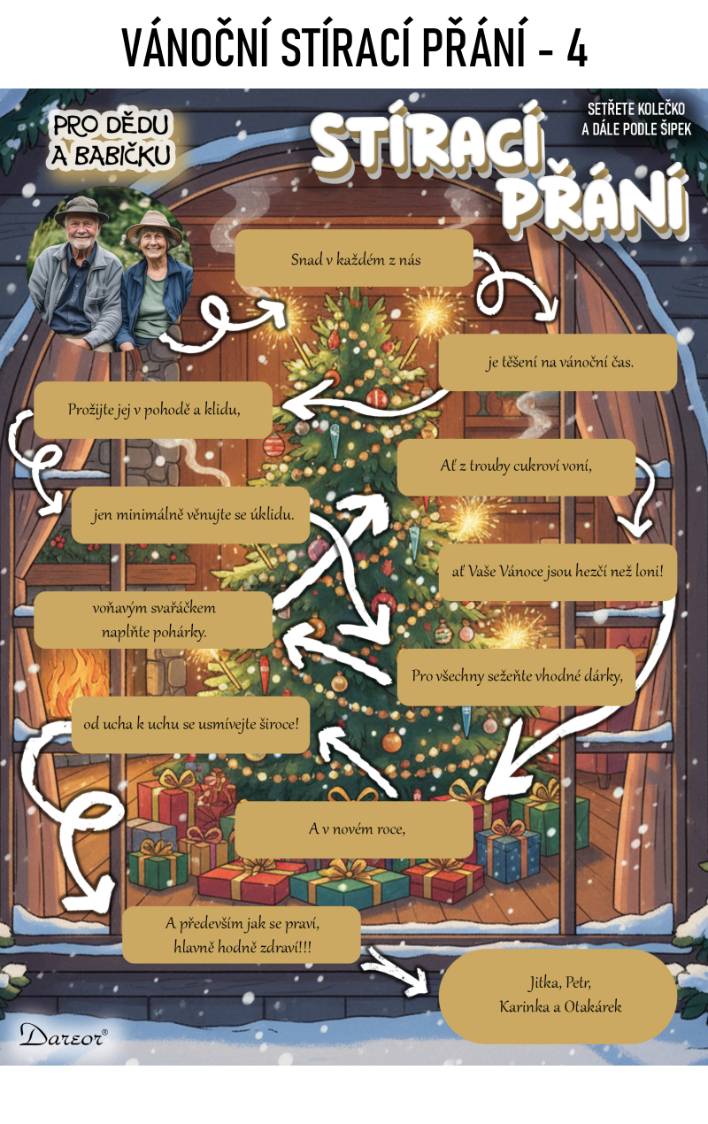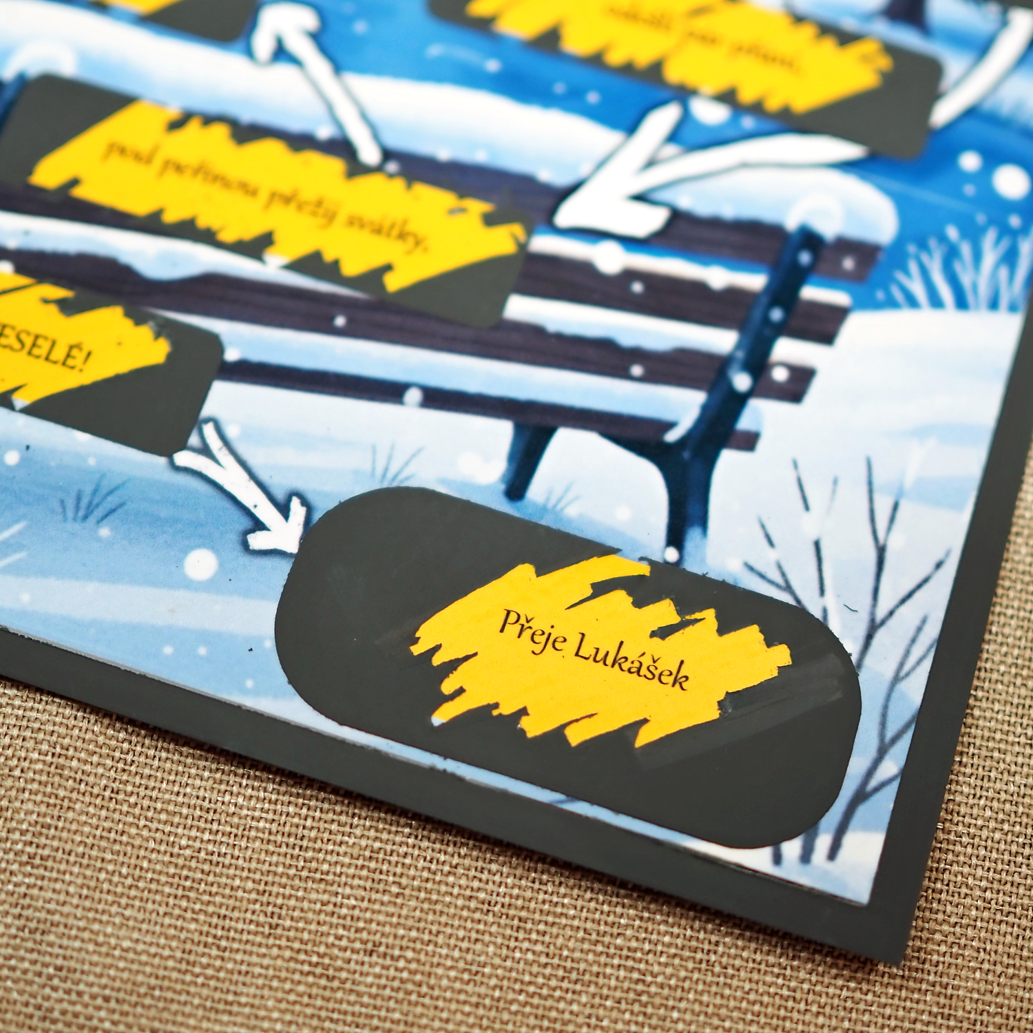 Pod startovním kolečkem se může ukrývat příplatková fotografie, ideálně obdarovaného, případně lze ponechat smajlíka tak, jak je vidět ve fotogalerii. Následuje 12 stíracích ploch, kdy do každé plochy se vejdou až 2 krátké řádky textu. Je na vás, zda si přesně zvolíte, jaký text do jednotlivých políček chcete nebo zda nám pošlete celé vánoční přání a jeho rozdělení na 12 částí necháte na nás. Pro případ, že vaše vánoční přání bude kratší bez možnosti rozdělení na 12 částí, bude v každém volném políčku zobrazen smajlík.