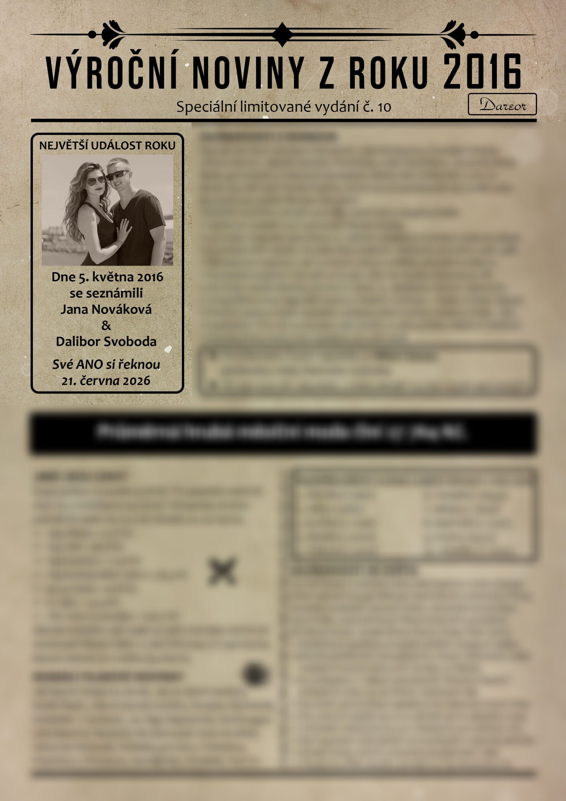 Svatební noviny v takovém případě nahrazujeme novinami výročními, a to z roku seznámení novomanželů (pokud k němu došlo minulý rok a déle). Například při seznámení v roce 2016 pak půjde o výroční noviny z roku 2016 a jako NEJVĚTŠÍ UDÁLOST ROKU je pod fotem uveden tento text: